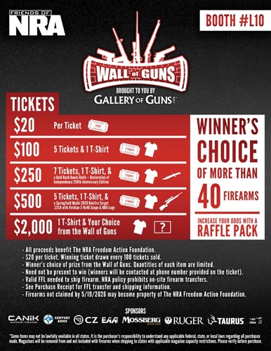 Kick off the 2026 NRA Annual Meetings and Exhibits by stopping by the always popular Wall of Guns raffle. Located in the main hallway at the George R. Brown Convention Center in Houston, TX, the Wall of Guns will be a must see attraction throughout the event. Try your luck, enjoy the excitement, and be part of one of the most talked about experiences of NRA Annual Meetings & Exhibits.